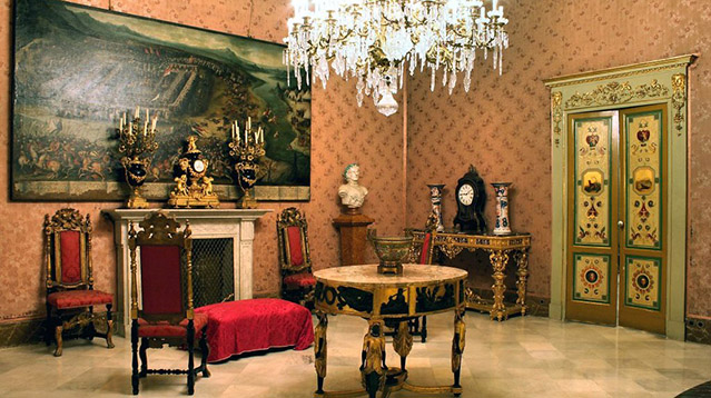 Il primo ambiente, con il pavimento in marmo, porte in legno intagliato e arazzi alle pareti, dà subito l’idea di entrare in un’altra epoca. La guida, vestita in modo impeccabile, accompagna un piccolo gruppo di visitatori da una sala all’altra, ognuna delle quali sembra un quadro in sospensione.